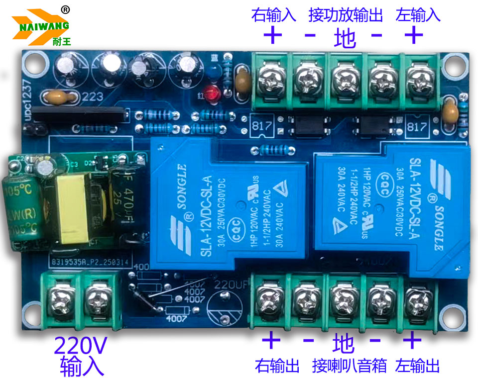 直接220V 供电(接到功放机总电源开关后就可以),喇叭线路承载电流30A,(PCB走线加宽开窗可以任意加厚加铜线以加大电流的通过能力)